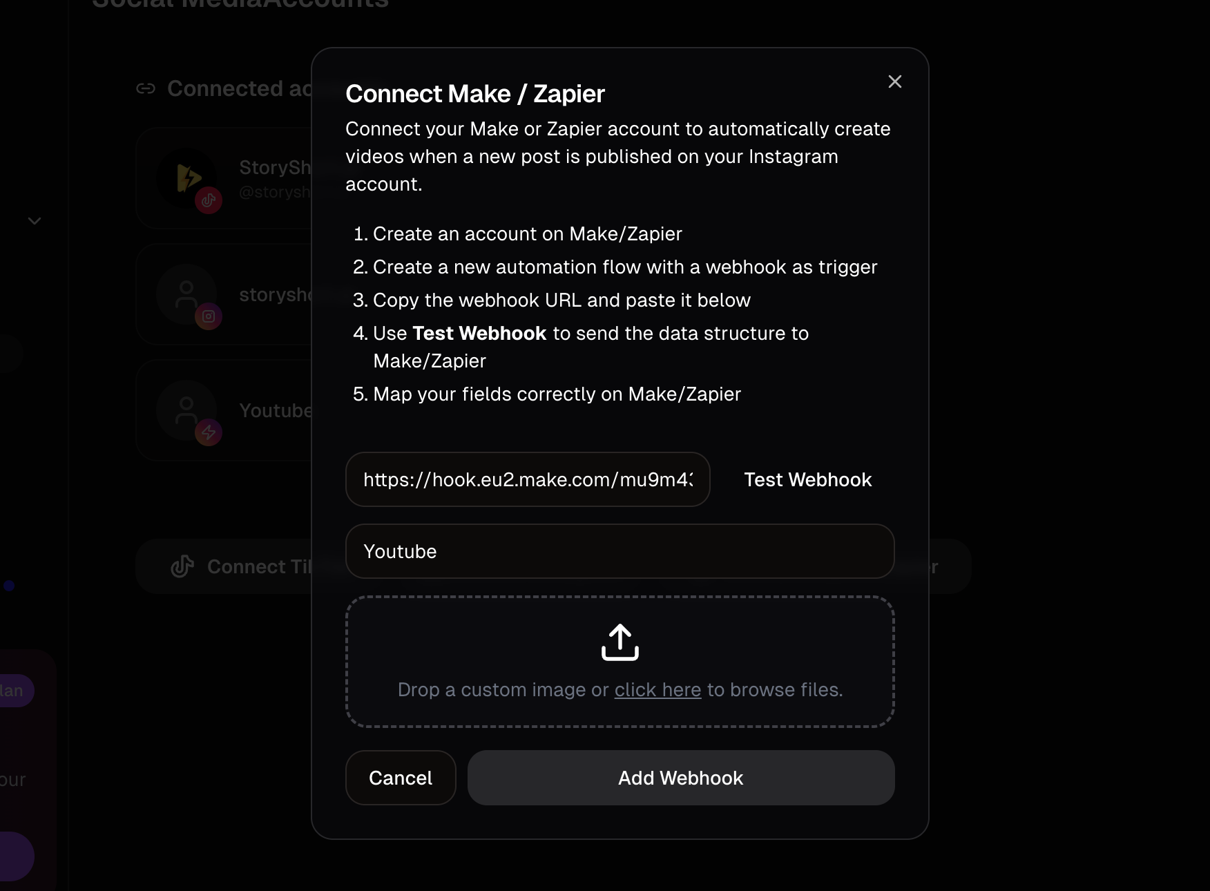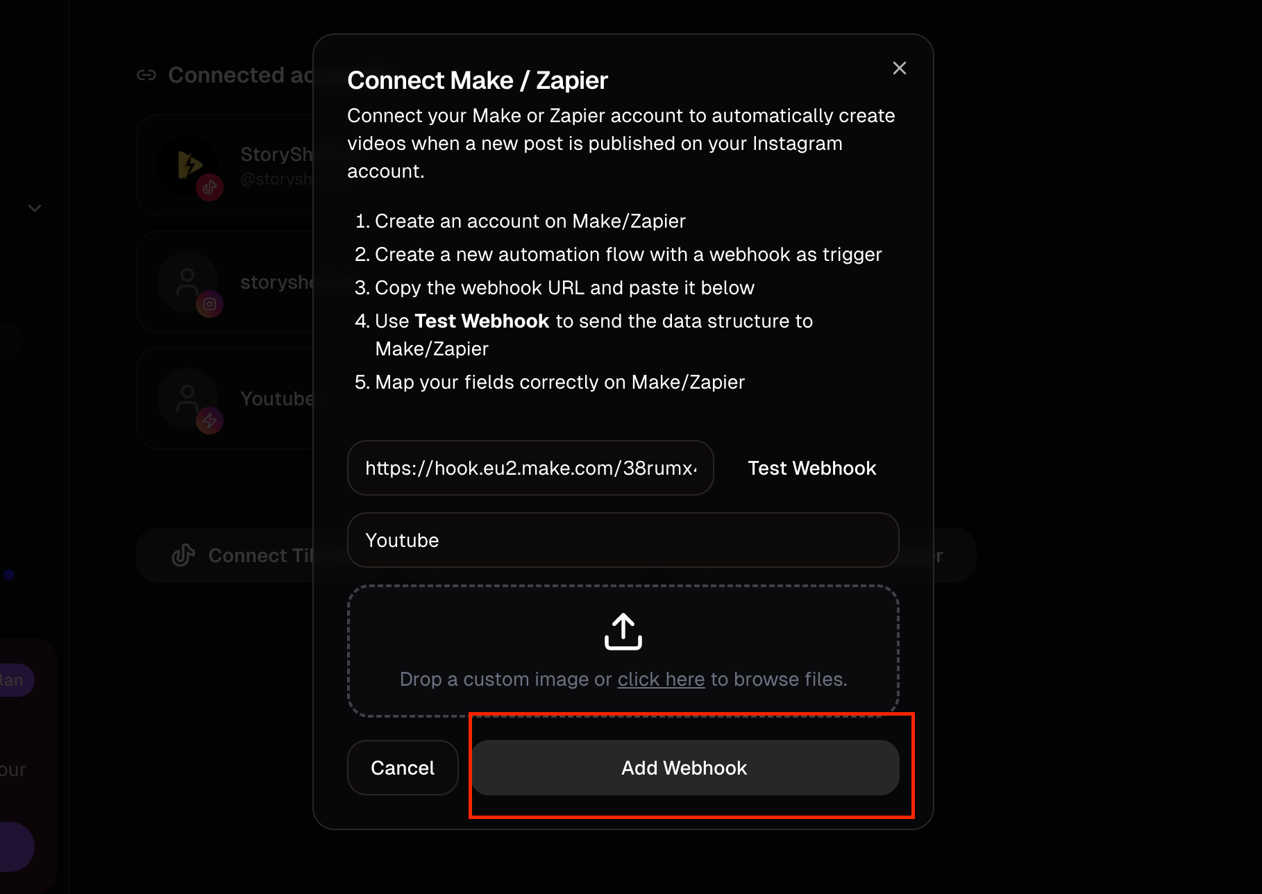 Then go back to StoryShort.ai and click on "Add webhook" to save the integration.