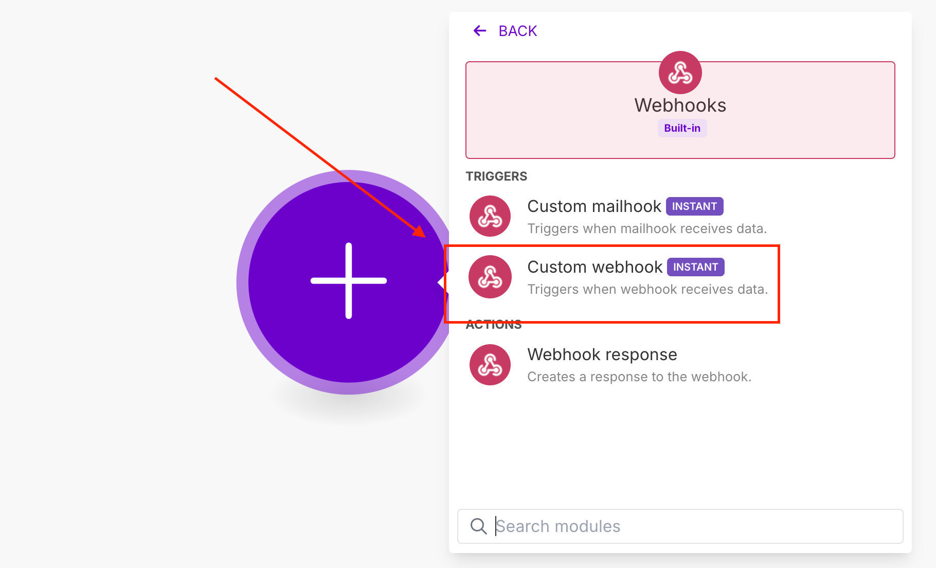 To get started we will use Webhooks as first step. Select "Webhooks" then "Custom webhook".