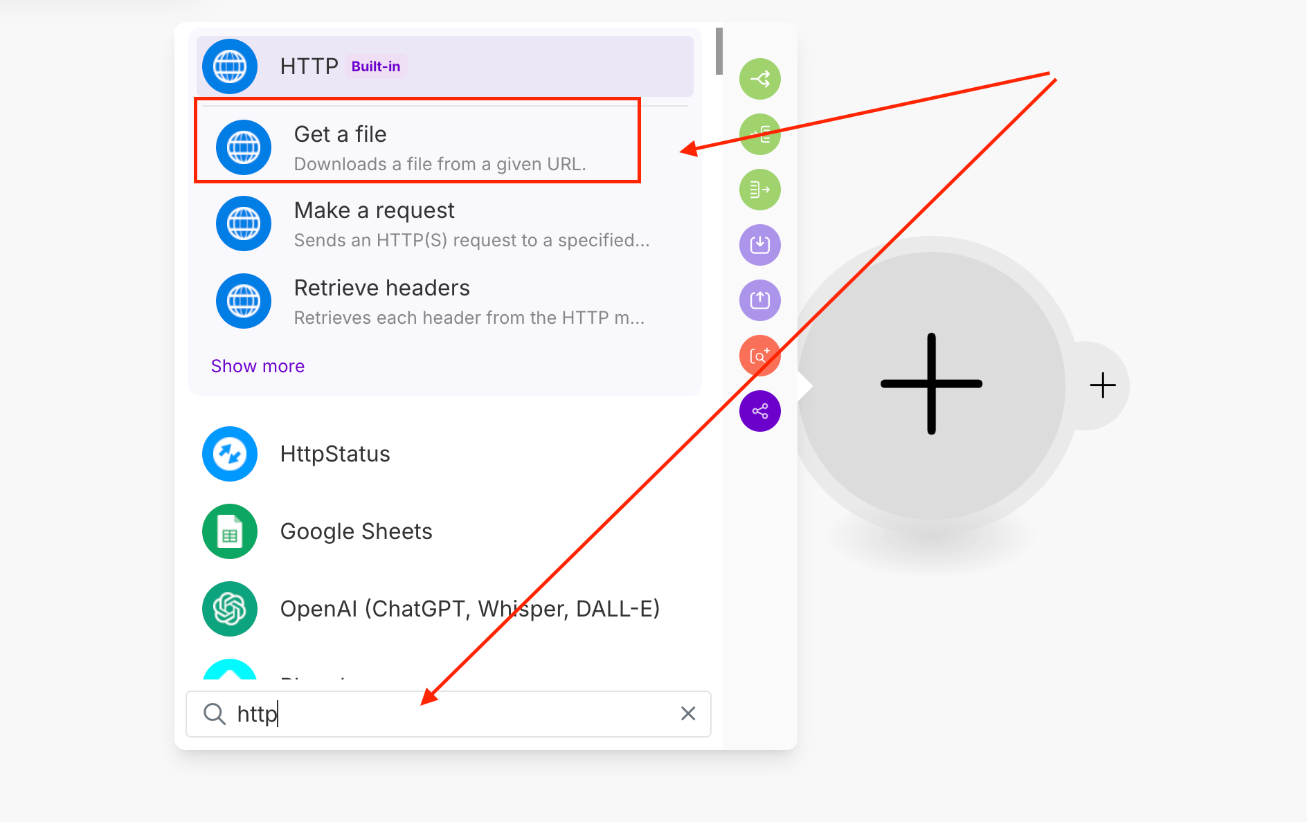 Now the next step consists in getting the video file before uploading it to Youtube, to do so we will add a new module to our scenario which is "Get a file".