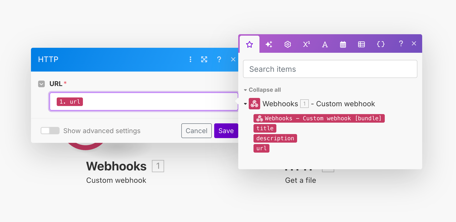 Now click on the URL field and select the filed "url", this way we indicate to Make.com that we want to download the file that is corresponding to that URL.