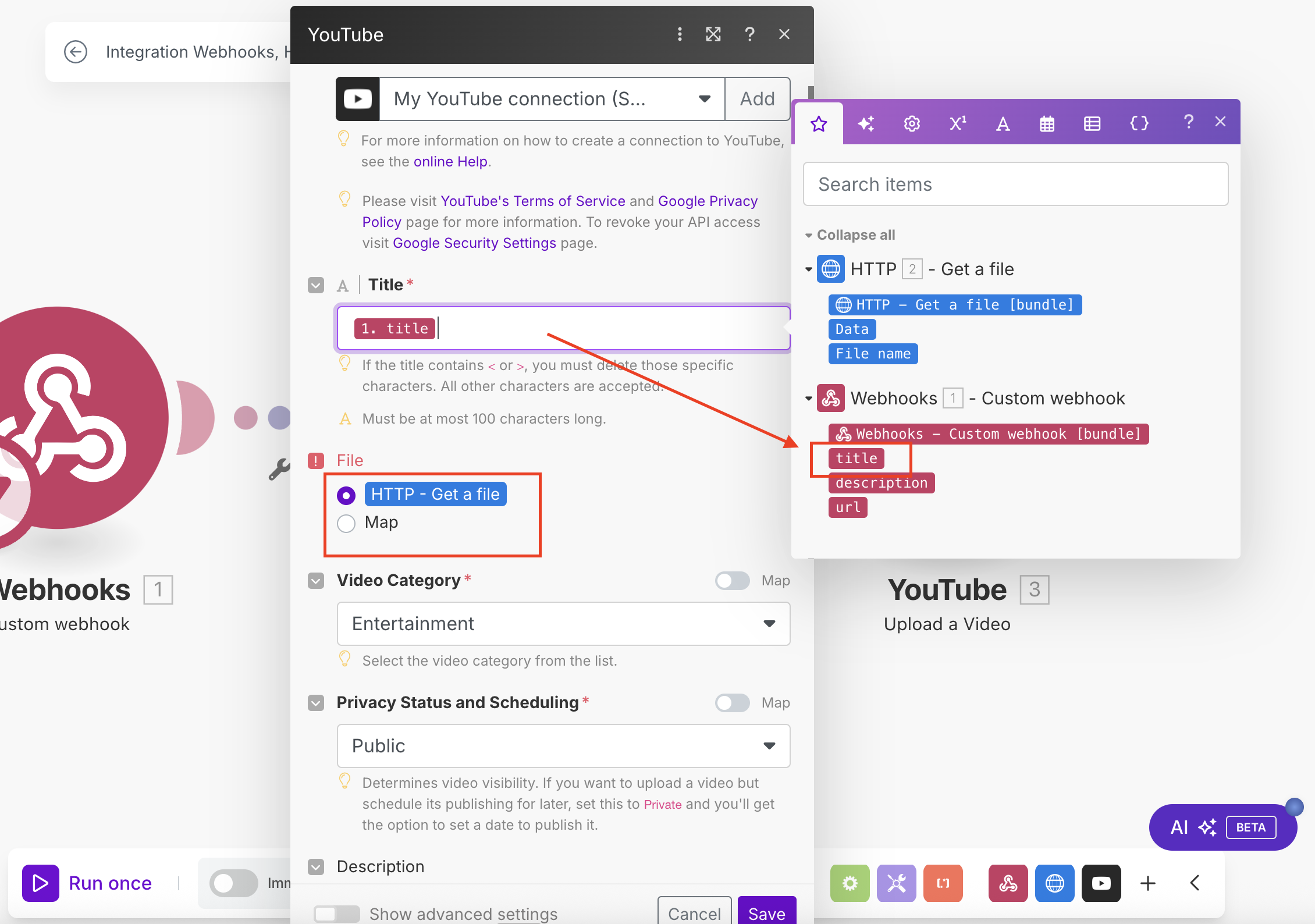 Add a new module to the scenario, search for Youtube and select "Upload a video".
